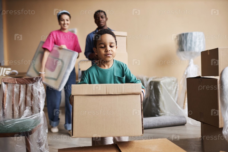 Милый мальчик несет упакованную картонную коробку и кладет ее на другую