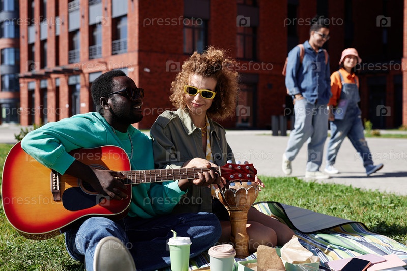Молодая пара Gen Z наслаждается пикником на траве в городе и играет на гитаре
