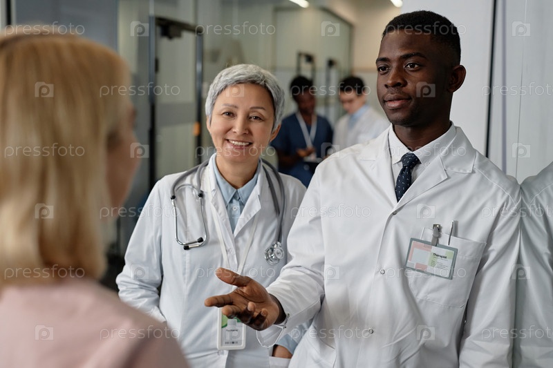 Молодой уверенный в себе врач общей практики разговаривает со своим помощником