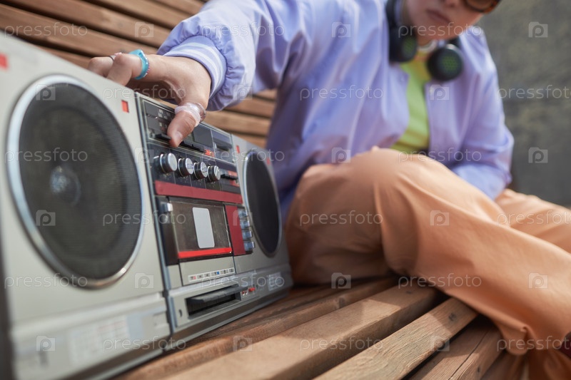 Ближайший снимок девушки, нажимающей кнопку на старой школьной бумбокс играет музыку городской