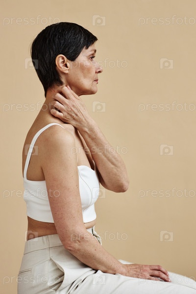 Минимальный снимок женщины, чесающей шею на нейтральном фоне