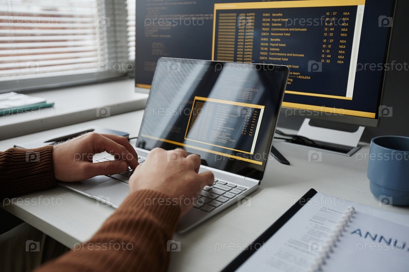 Близкий снимок мужских рук, печатающих на клавиатуре ноутбука и пишущих код