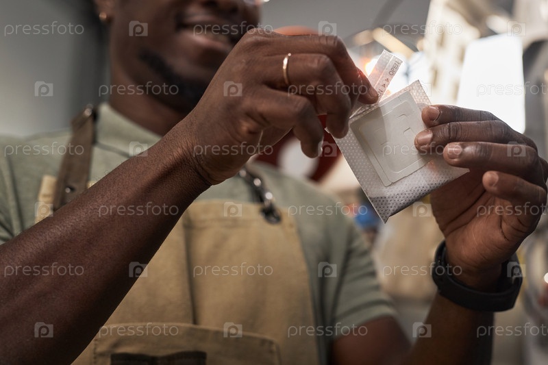 Работник, открывающий кофейную капсулу для мужского пола Инспектирует производство на пищевой фабрике