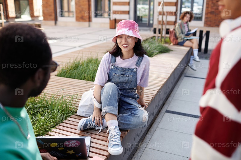 Азиатская девушка разговаривает с группой друзей в кампусе