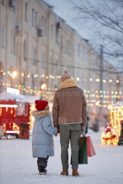 Обратный вид отца и ребенка, держащихся за руки во время ходьбы зимой