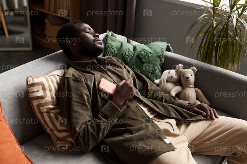 Чернокожий мужчина засыпает на диване дома со смартфоном на груди