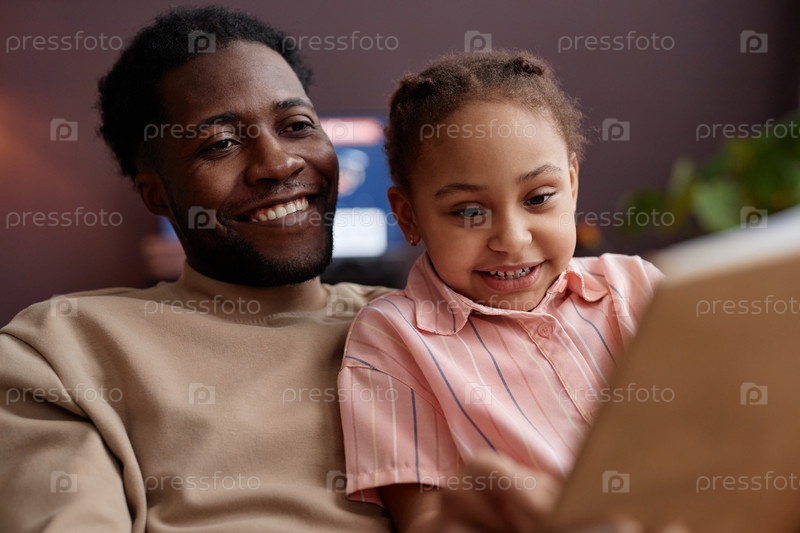 Ближайший чернокожий отец и дочь читают книгу дома, а