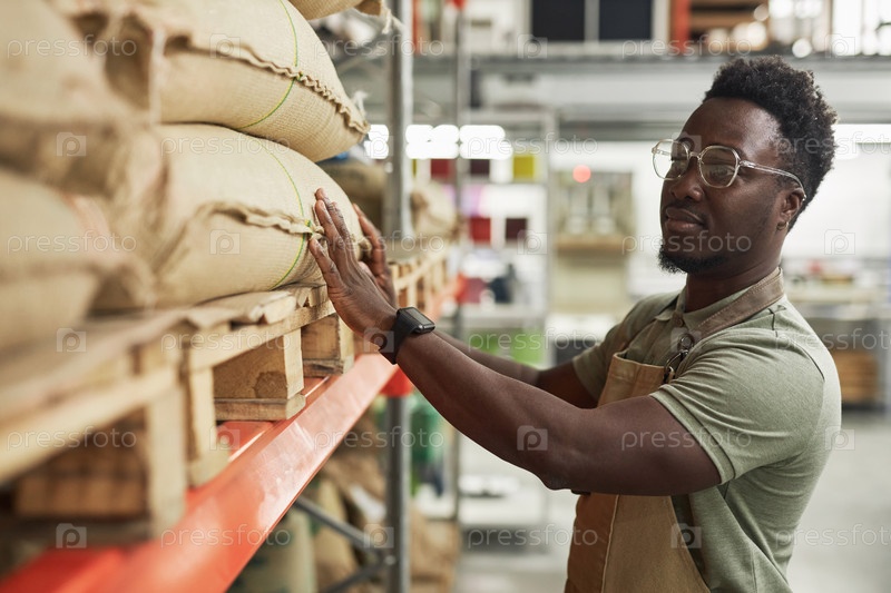 Чернокожий человек проверяет буровые кофейные пакеты на полке в обжарнике