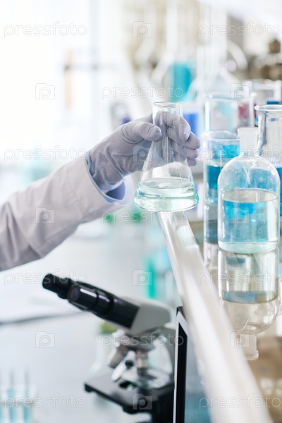 Лабораторный работник, держащий медицинскую бутылку