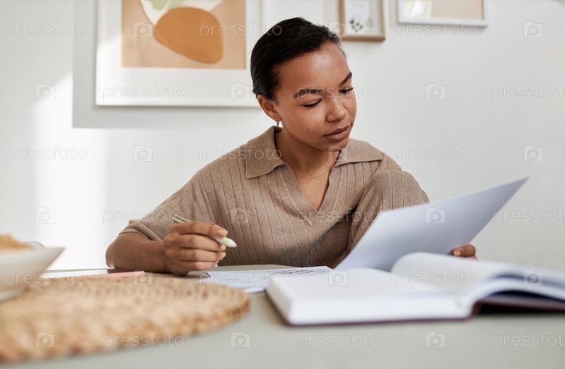 Молодая чернокожая женщина читает документы дома, учится или делает налоги