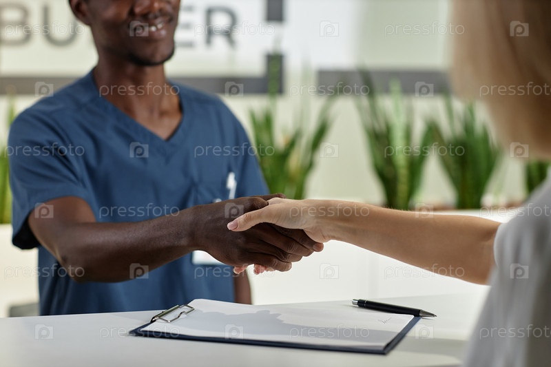 Сосредоточьтесь на рукопожатии молодого врача или секретарши и женщины-пациента