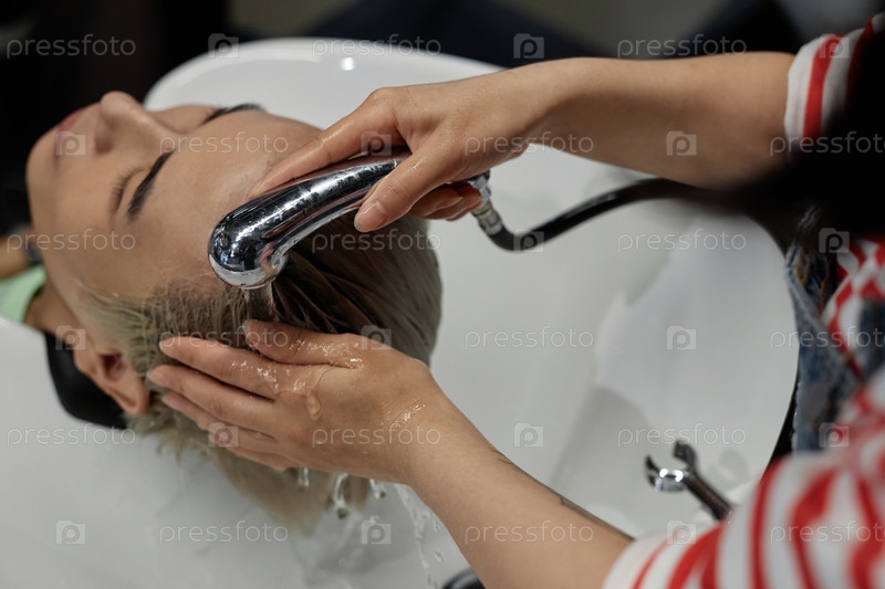 Парикмахер тщательно моет волосы мужского клиента в раковине салона красоты