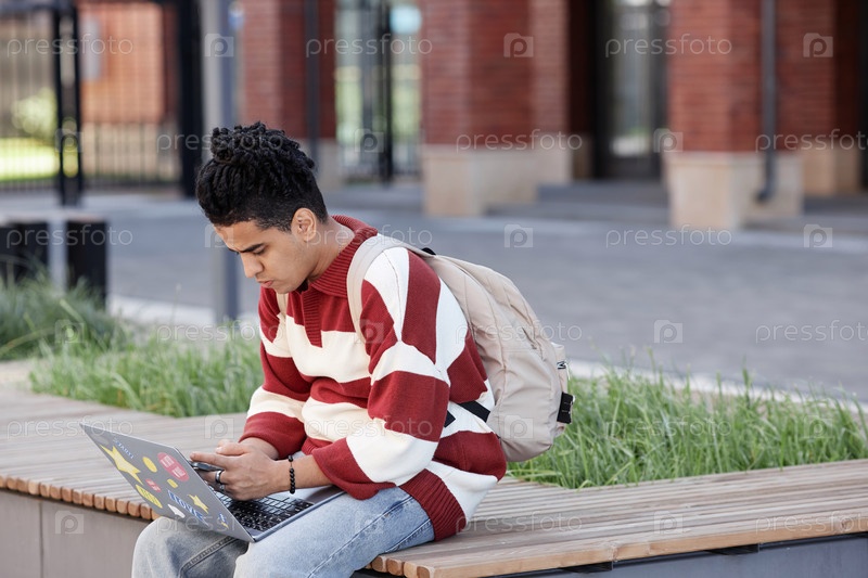 Ближневосточный молодой человек в качестве студента, использующий ноутбук на открытом воздухе в кампусе колледжа