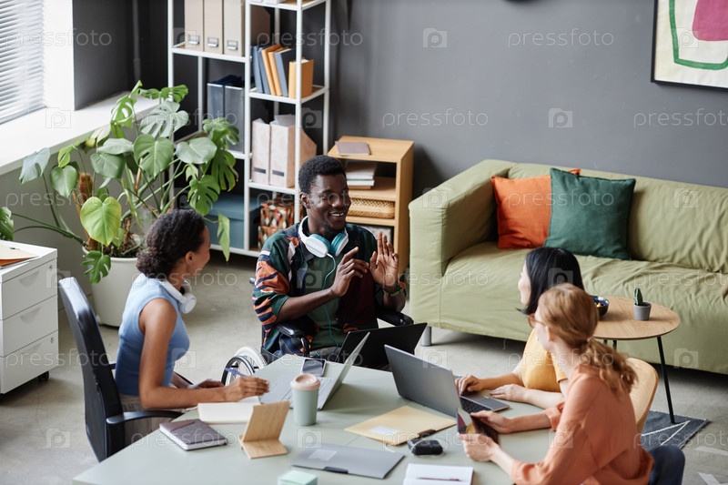 Чернокожий мужчина с инвалидностью делится идеями со своими коллегами во время деловой встречи
