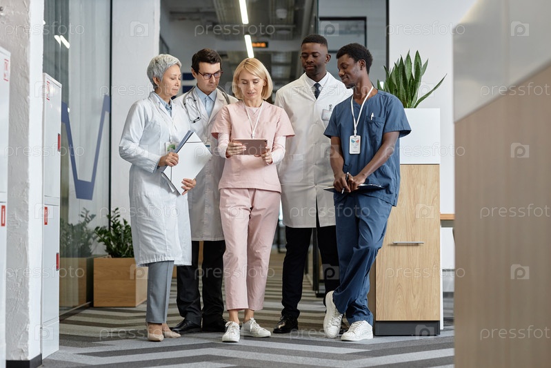 Группа современных клиницистов, смотрящих на экран планшета во время рабочей встречи