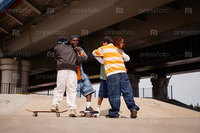 Группа молодых стильных друзей в модной одежде, обнимающих друг друга