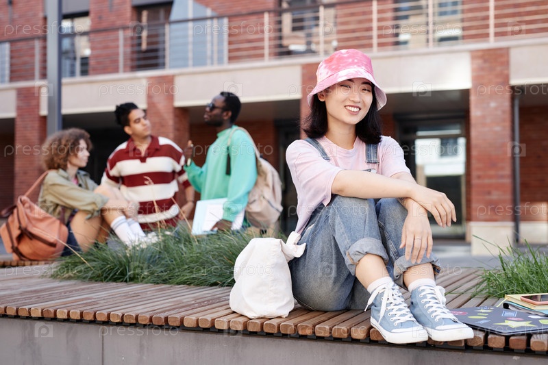 Молодая азиатская женщина в джинсовых комбинезонах и улыбается перед камерой