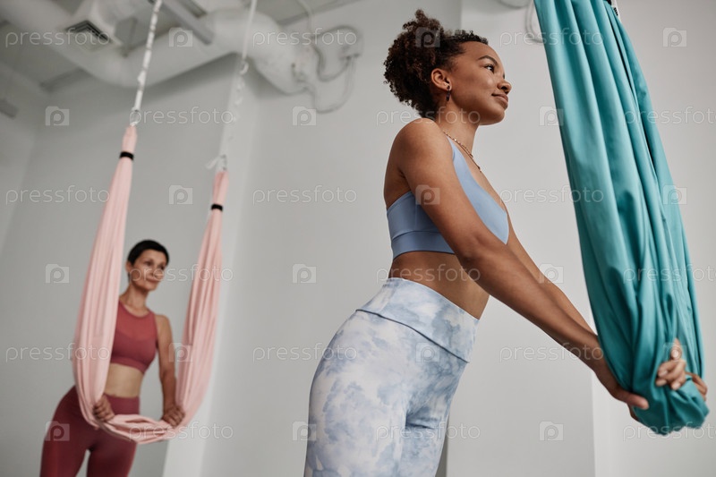 Молодая афроамериканская женщина практикует воздушную йогу