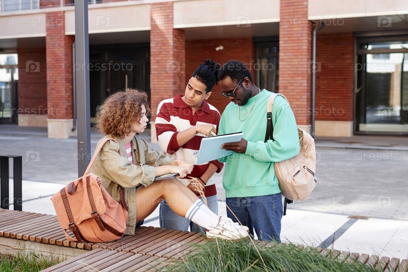 Студенты колледжа обсуждают школьный проект на открытом воздухе в кампусе