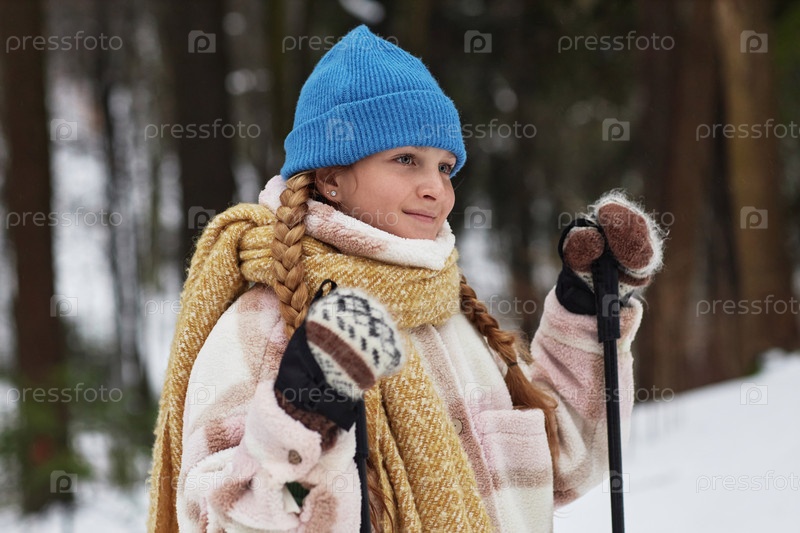 Боковой вид молодой девушки с троллейбусовыми палочками, стоящей перед камерой