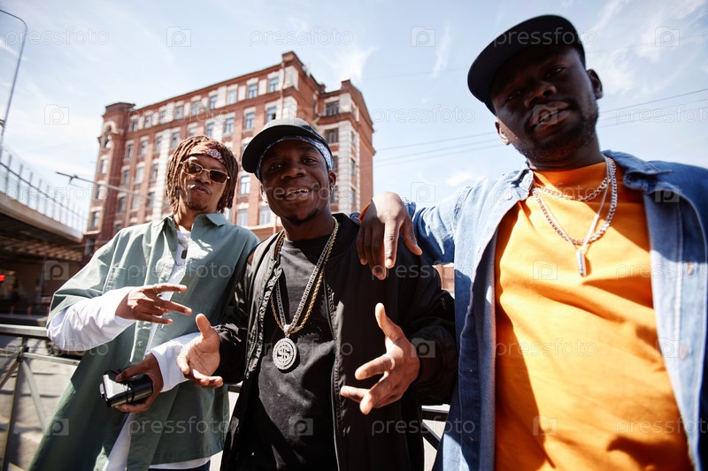 Три счастливых молодых афроамериканских исполнителей хип-хопа смотрят на камеру