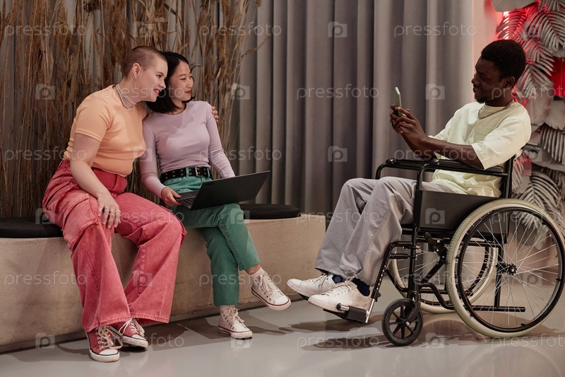 Разнообразная группа молодых людей, фотографирующих со смартфонами в офисе