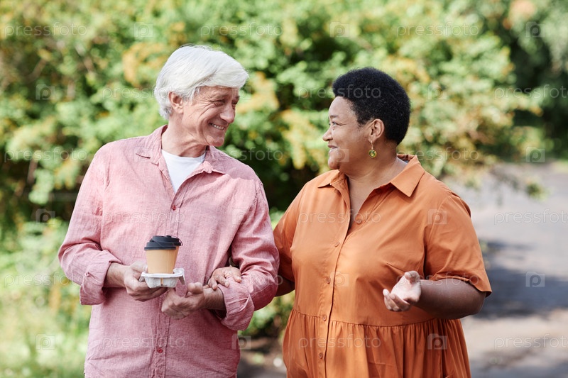 Счастливая старшая пара наслаждается прогулкой в парке на свежем воздухе вместе и болтает