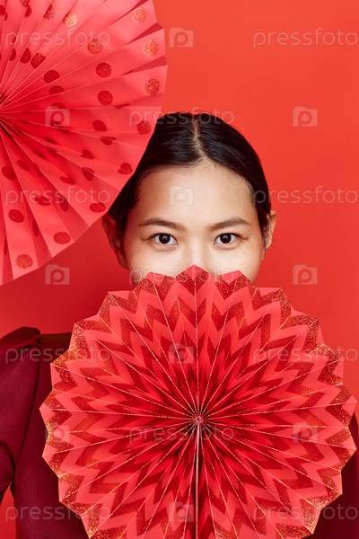 Азиатская женщина с бумажными вентиляторами