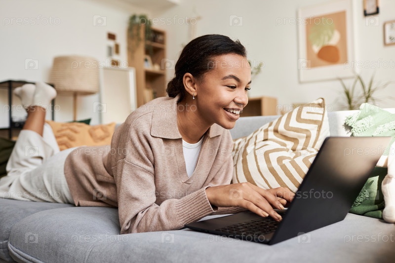Улыбающаяся чернокожая девушка использует ноутбук, лежа на диване в уютном доме