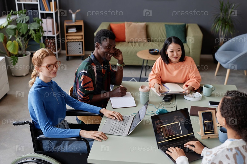 Молодая IT-команда встречается за столом в офисе и обсуждает разнообразный проект