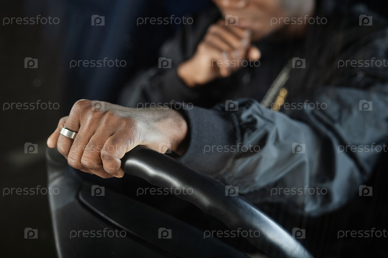 Сосредоточьтесь на руке молодого чернокожего мужчины в стильном куртке за рулем автомобиля