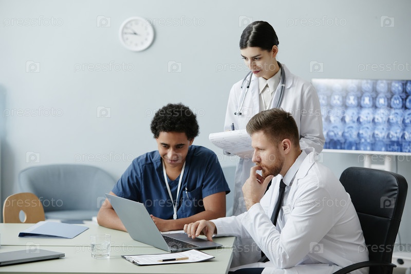 Мультиэтническая группа врачей, использующих ноутбук вместе в клинике