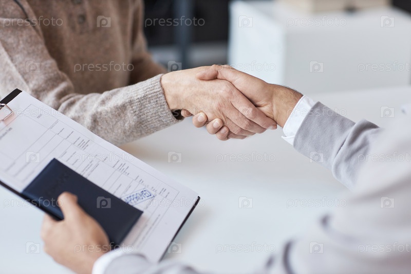 Пожимание рук женщины-менеджера центра подачи виз и мужского заявителя