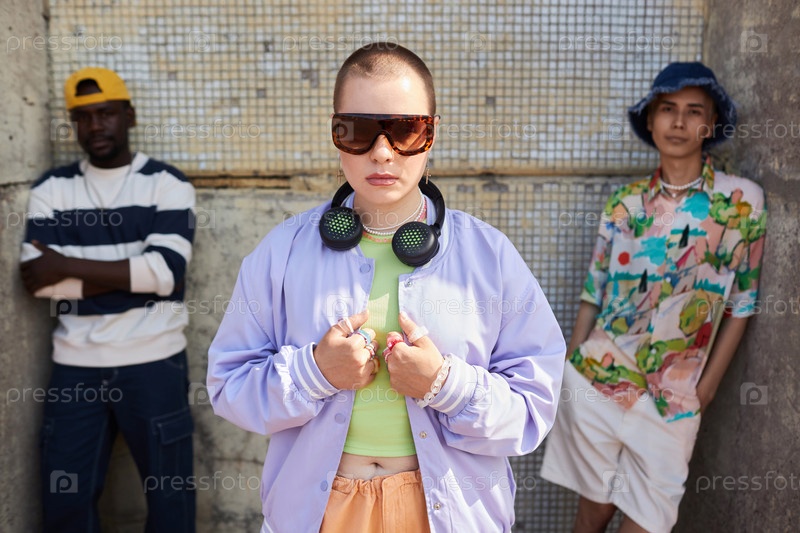 Три молодых человека, стоящих в городе с лысой девушкой на переднем плане