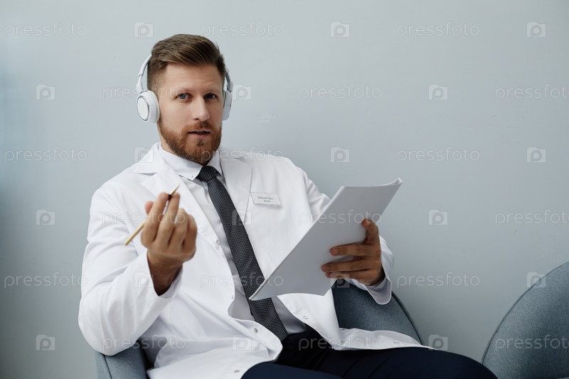 Бородатый врач разговаривает с пациентом через видеочат