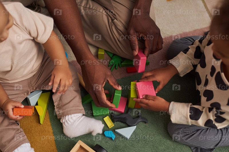 Верхний вид Черный отец с двумя детьми, играющими вместе с деревянными игрушками