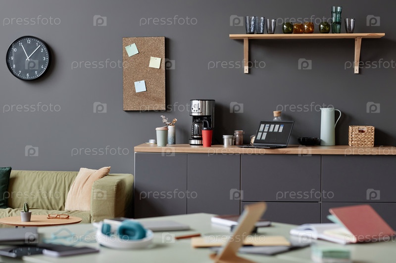 Переполненное офисное пространство в нейтральном сером цвете с акцентом на кофейную станцию