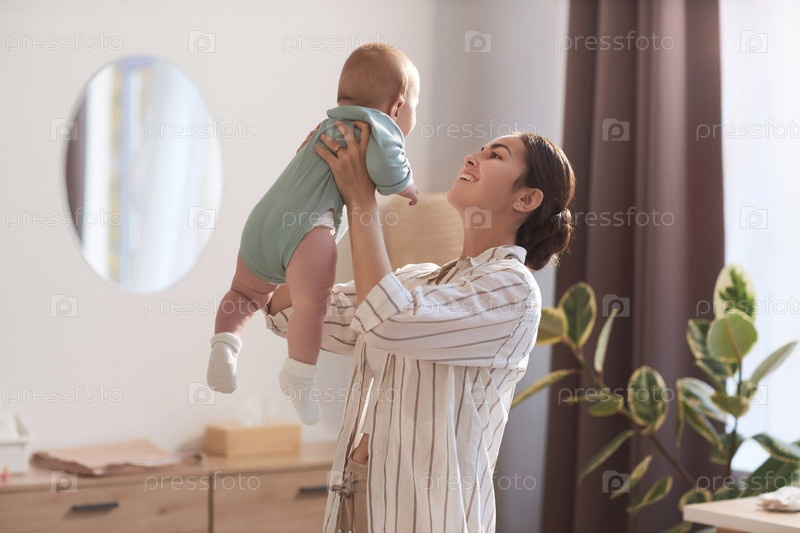 Беспокойная молодая мать играет с сыном