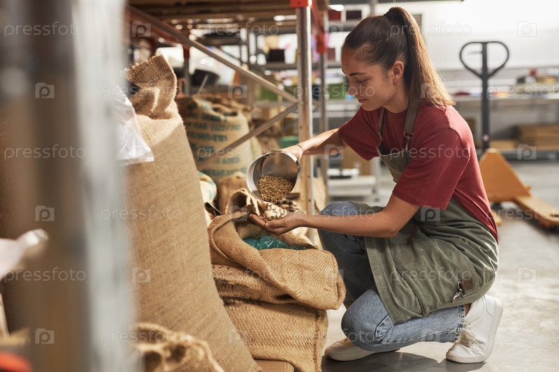 Улыбающаяся женщина подбирает свежие кофейные бобы в кофеварке