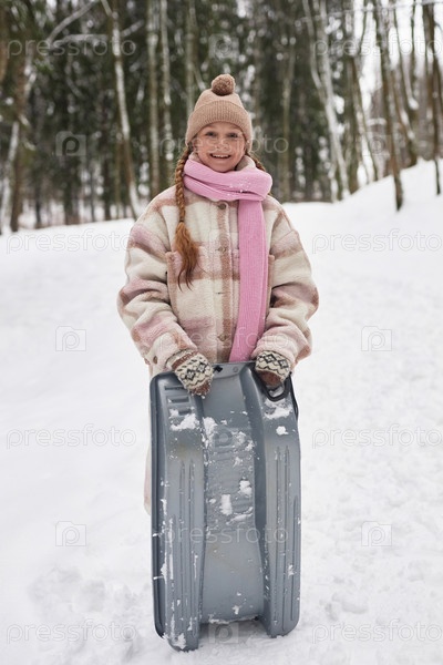 Милая улыбающаяся до-подростковая девочка в зимней одежде, держащая ролики на санях