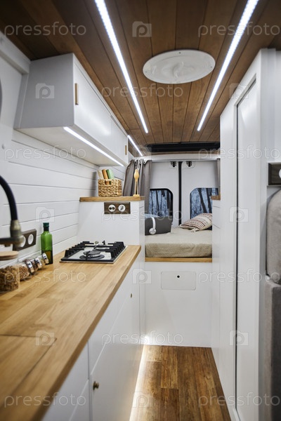 Современный интерьер трейлерного фургона с кроватью и кухней