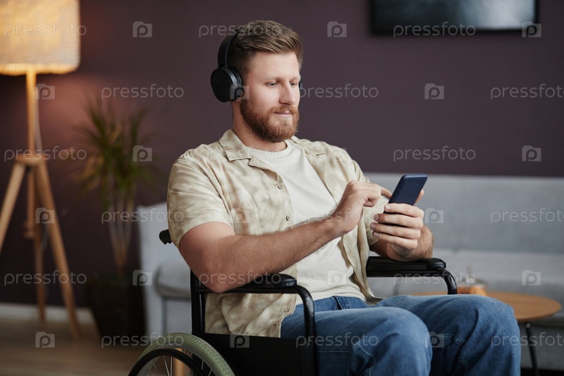 Человек с инвалидностью, носящий наушники дома и слушающий музыку