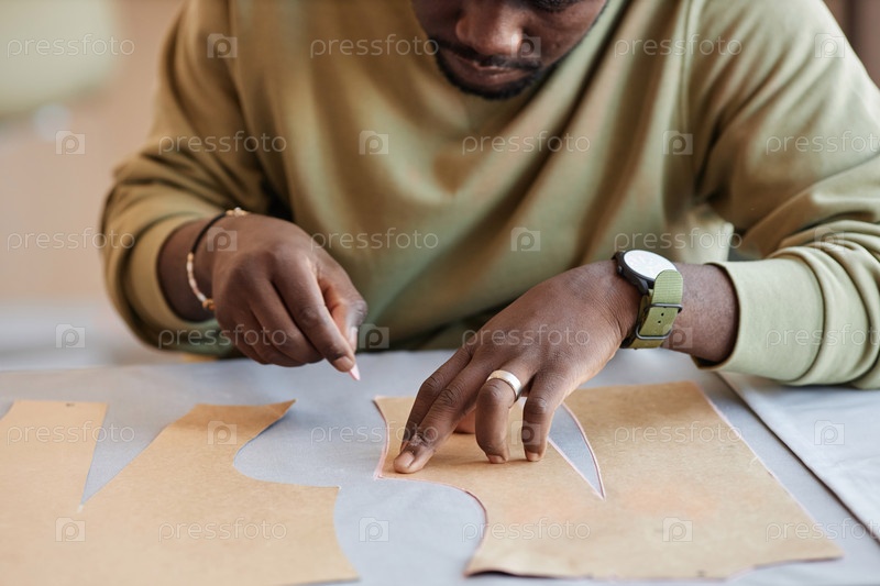 Руки молодого портного мужчины с куском мела контурируют швейные узоры