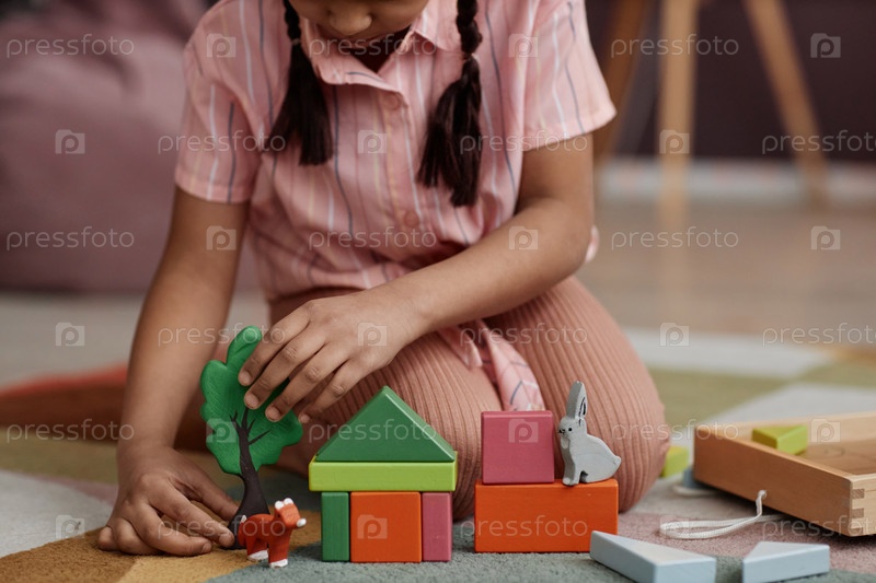 Закройте маленькую девочку, играющую с деревянными игрушками