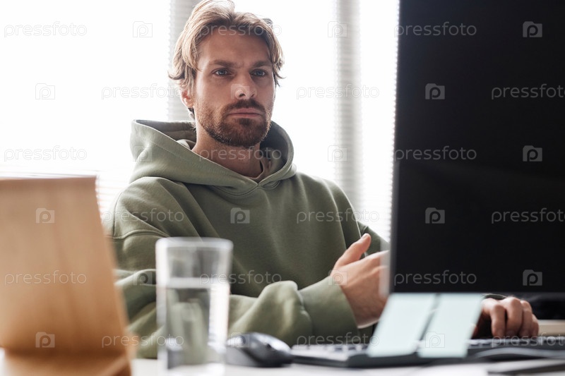 ИТ-программист смотрит на компьютерный экран Работает в офисе