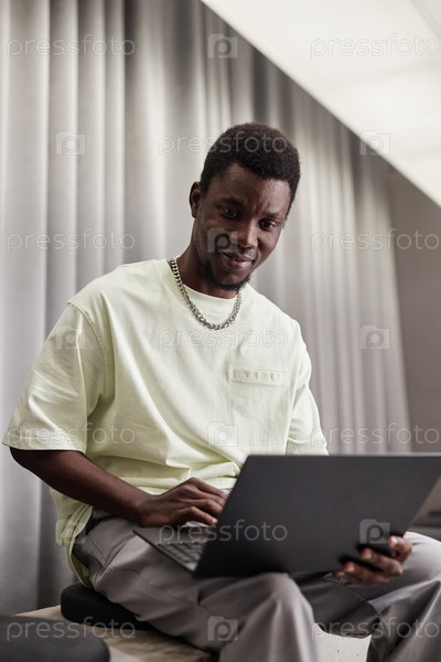 Молодой афроамериканский мужчина использует ноутбук в офисной гостиной