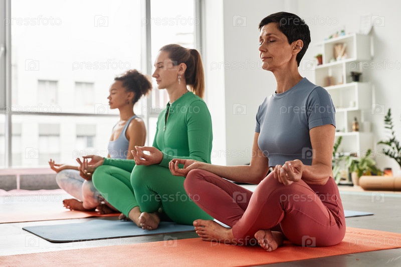 Три женщины, сидящие в ряд в положении лотоса и медитирующие