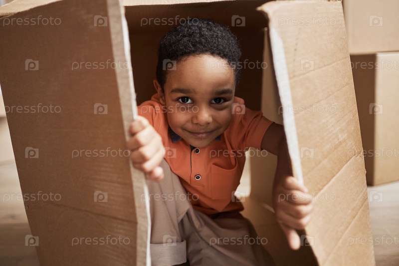 Милый улыбающийся афроамериканский мальчик смотрит из большой картонной коробки