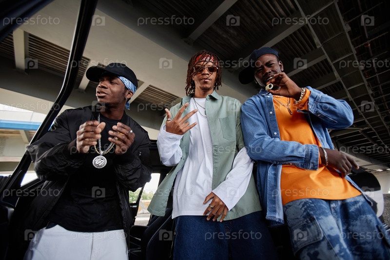Три стильных молодых афроамериканских мужчины в модных нарядах стоят рядом с машиной