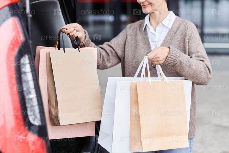 Близкий снимок женщины, кладящей бумажные сумки для покупок в багажник машины на открытом воздухе на парковке